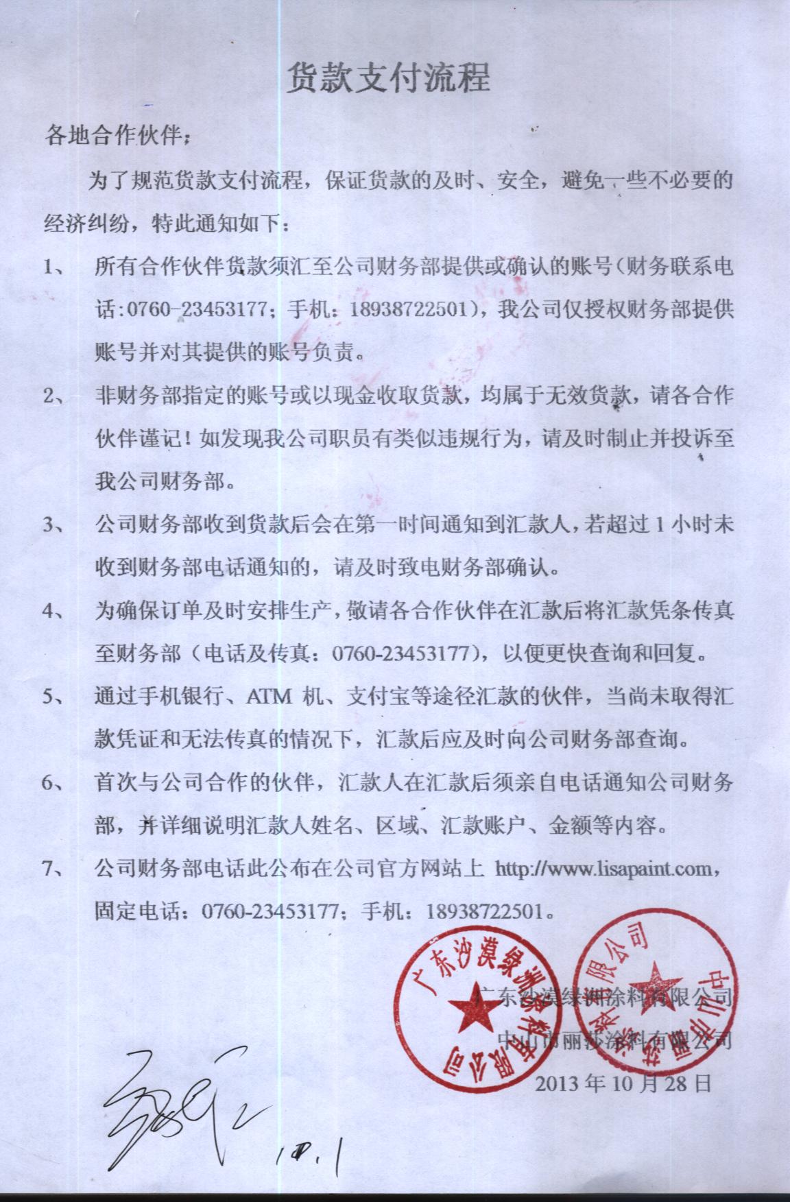 沙漠綠洲涂料有限公司貨款支付提示